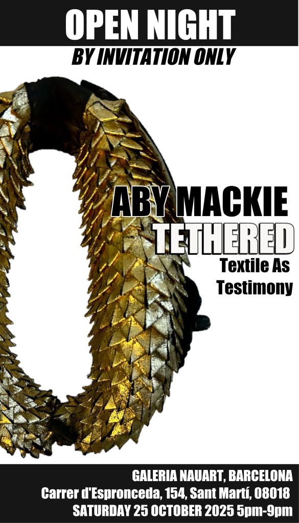 Aby Mackie inaugura su exhibición “Tethered” donde transforma el textil en relato y materia viva. Con una obra intensamente poética y cargada de memoria, reúne fragmentos de telas halladas, objetos cotidianos y palabras para construir piezas que hablan de identidad, desarraigo y resistencia. En esta exposición, el artista nos invita a adentrarnos en un universo íntimo y visualmente poderoso, donde cada puntada y cada textura tiene una historia que decir.