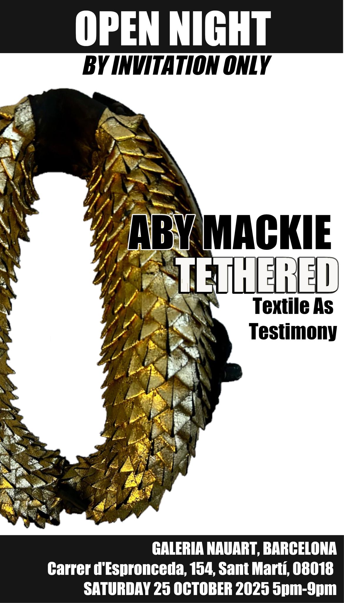 Aby Mackie inaugura su exhibición “Tethered” donde transforma el textil en relato y materia viva.